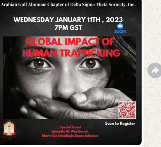 On 11 January 2023,WOCON was invited as a panelist by the Arabian gulf Alumnae of Delta Sigma Theta Sorority Inc. to a Webinar to discuss the GLOBA IMOACT OF HUMAN TRAFFICKING.objective of this webinar was to educate people of the risks associated with Human Trafficking and red sign to look out for.